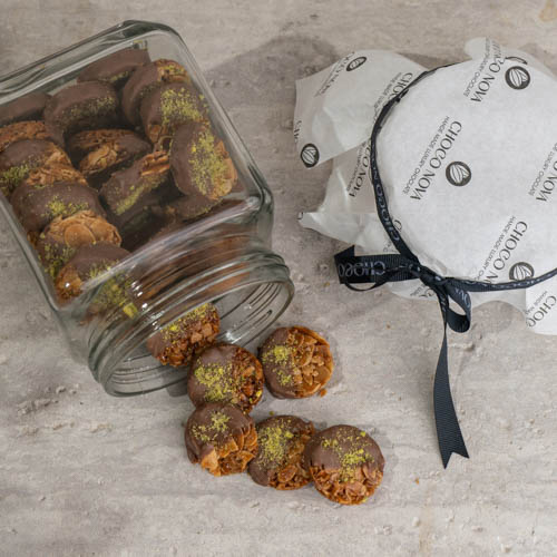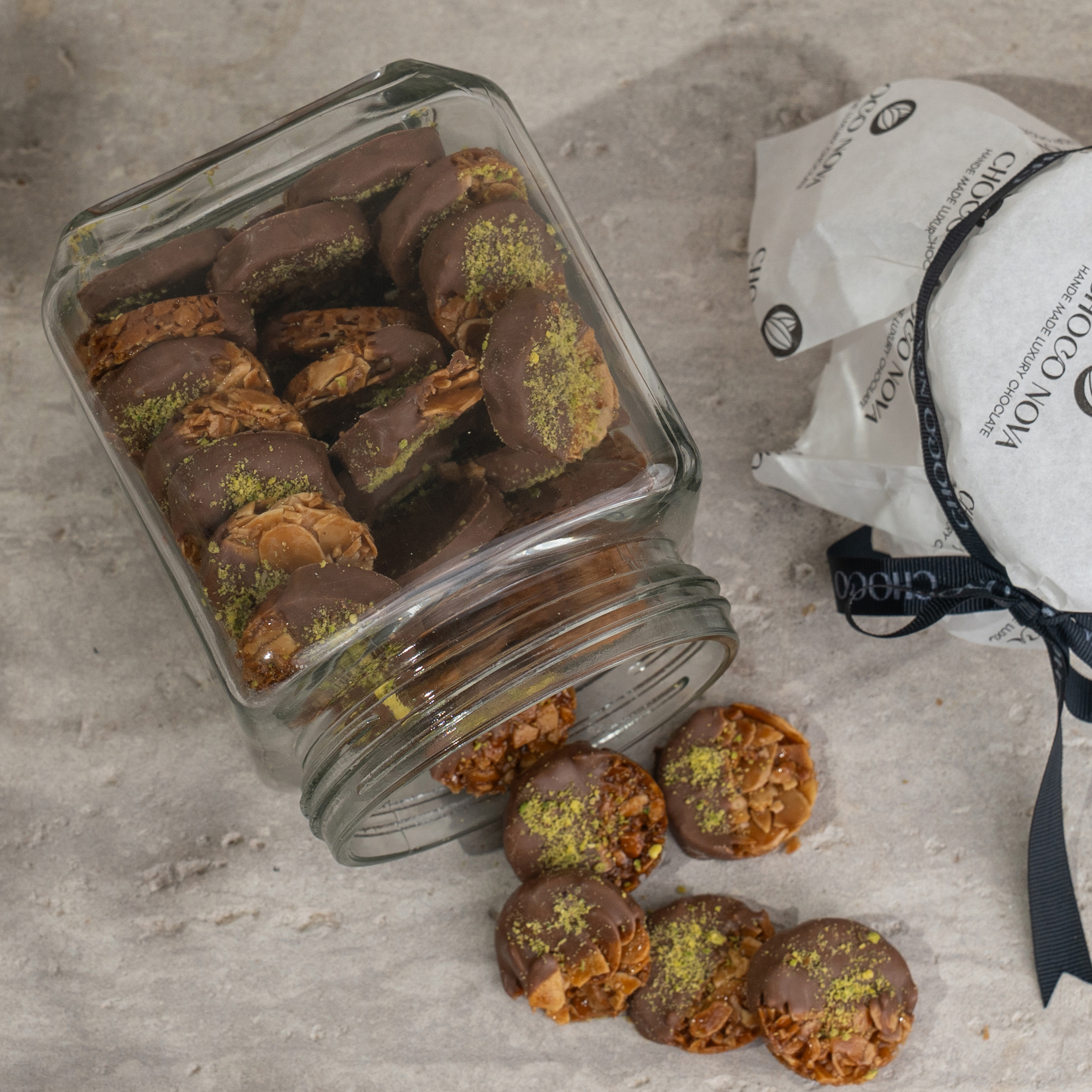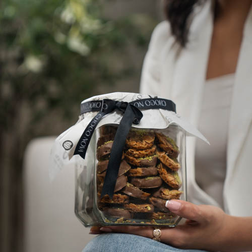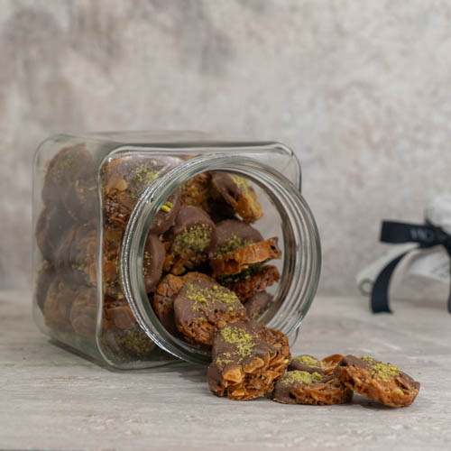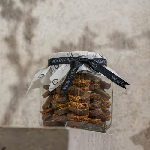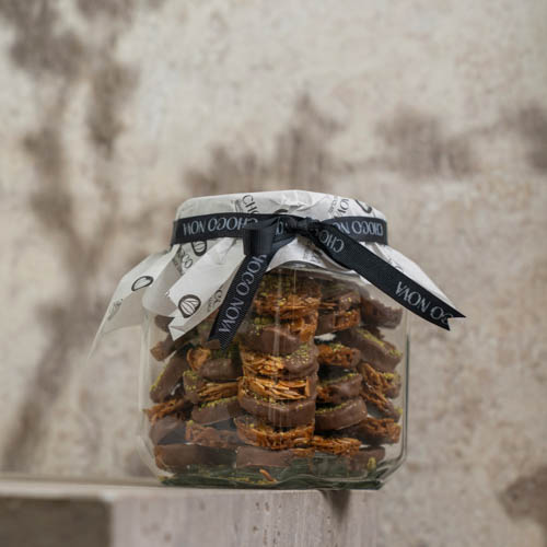 برطمان زجاج يحتوي على نصف كيلو من شرائح الالموند بالشوكلت